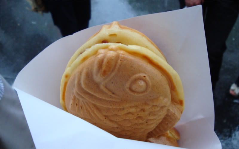 After class a bunch of the Japanese students and the JLSP students decided to walk around and eat dinner. We stopped at a shrine called Kagurazaka which was a bit interesting, and then kept walking around until we found something else. We came across a little shop that sold little pancake like things filled with custard, chocolate, etc. I bought two - one with cheese and one with macha tea & bean paste. Those, were, delicious.