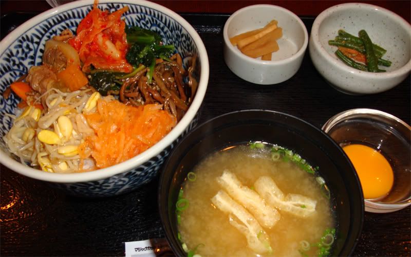 We continued walking and found the restaraunt called 'Shirokiya' where I ate a Bibinbadon. It's kind of like a Korean beef thing with a bunch of kimchee-like stuff in it. It was pretty good, having been the first time, but I thought it was rather small for 800yen. We sat around for a couple hours and just tried to converse with one another. Afterward, everyone had to travel their separate ways and the rest of us went home. Although it was a rather slow day, hopefully we'll be doing more this week and travelling unknown areas.