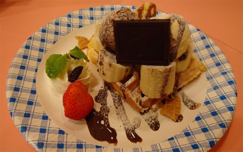 So we made our way through the floors checking out the little things they had, and finally came across the "Ice Cream City" where there must have been about 8~10 stores selling different types of ice cream. It was an insanely hard decision to make because every single one of the ice creams/gelatos looked delicious. I finally made up my mind and got this Belgian waffle with ice cream, bananas, a strawberry, whipped cream, and chocolate/caramel spread over the entire thing. That was so sweet and good it was almost worth the 980yen I paid for it. :D