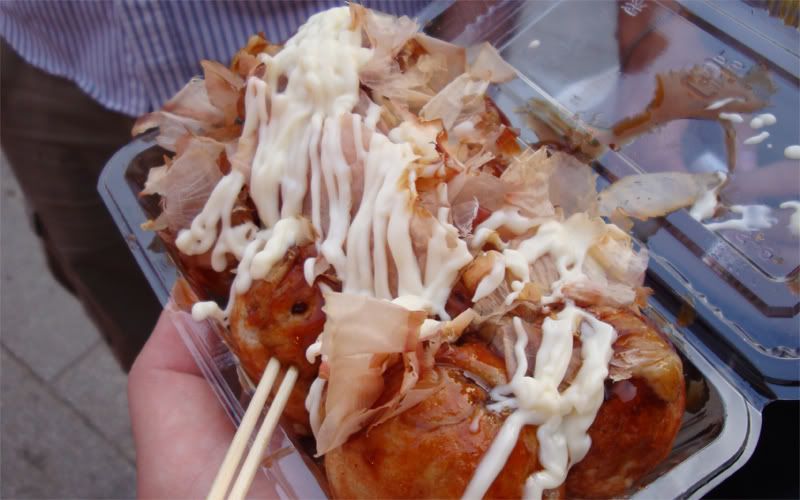 The food, oh man, the food was the best. I had an Okonomiyaki & Takoyaki while I was there. Simply, fantastic. And I had other things too like this sugar covered strawberry & a Blue Hawaiian Ramune soda.